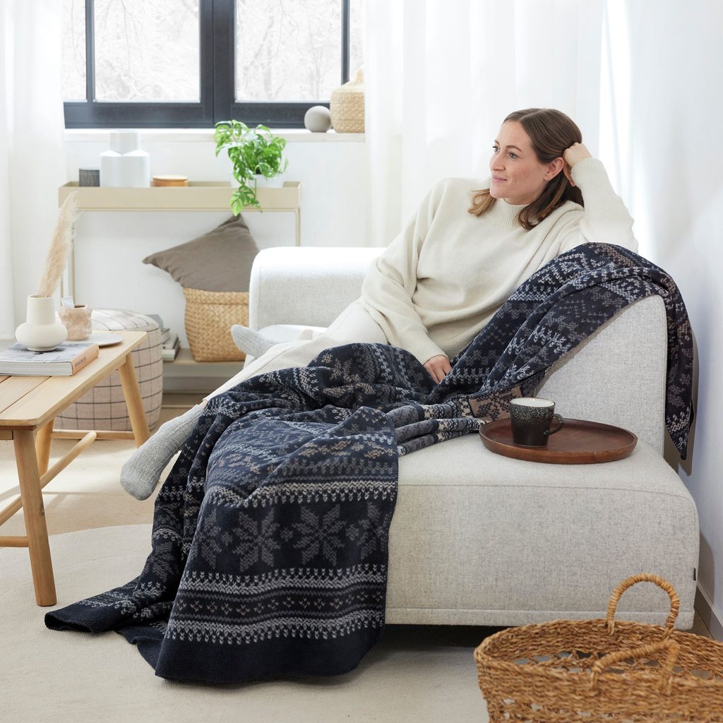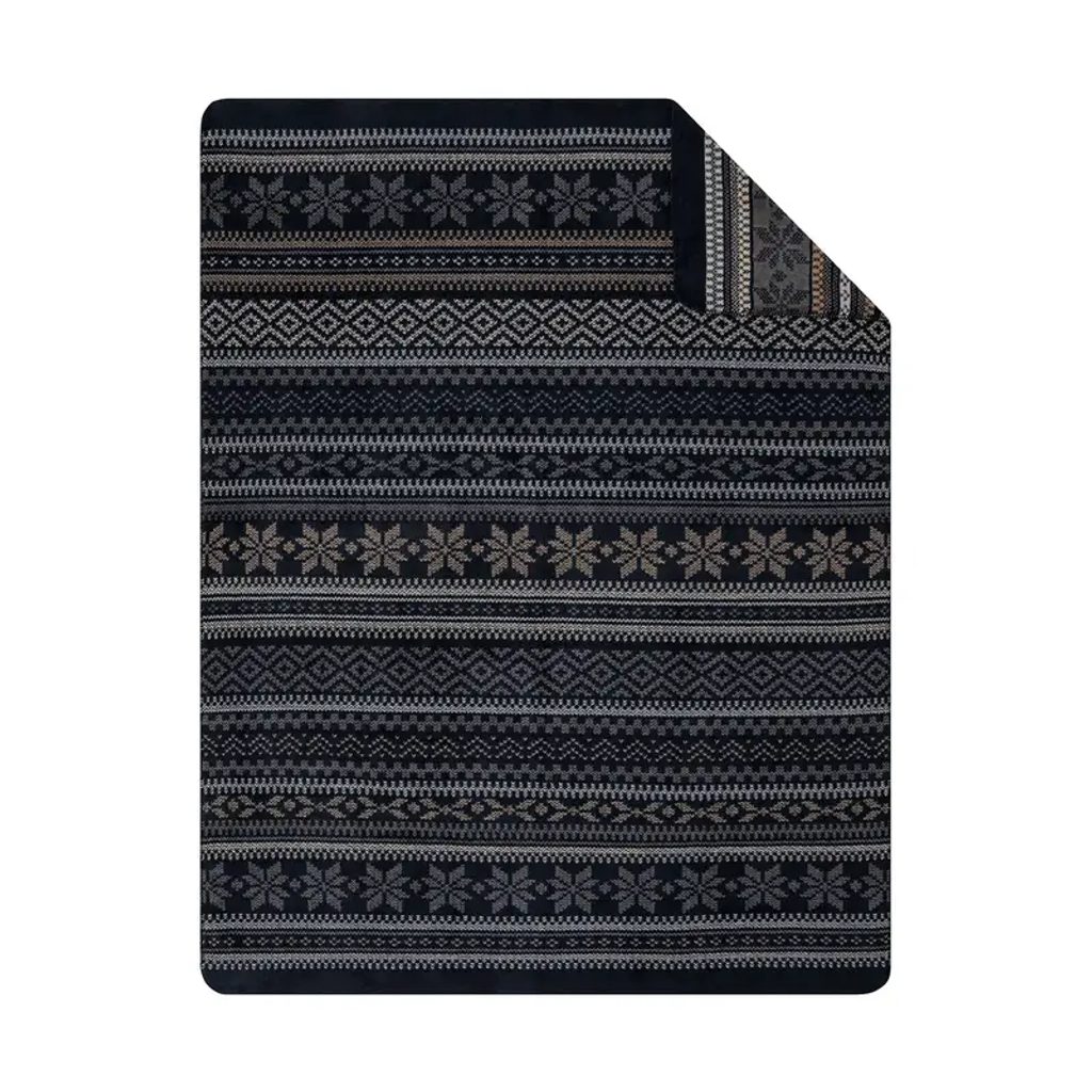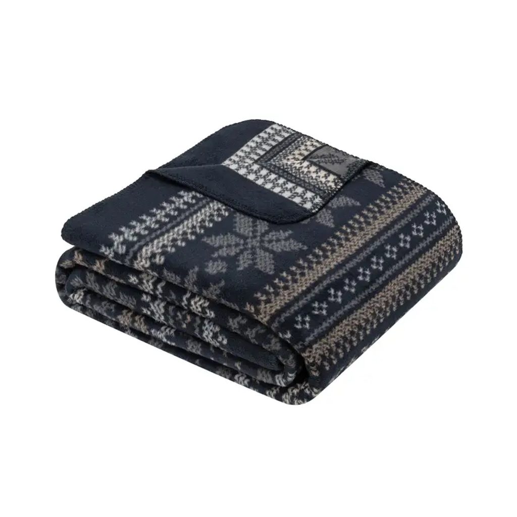 Žakárový pléd s ozdobným stehem po obvodu. Zimní motiv modré a šedé barvě.