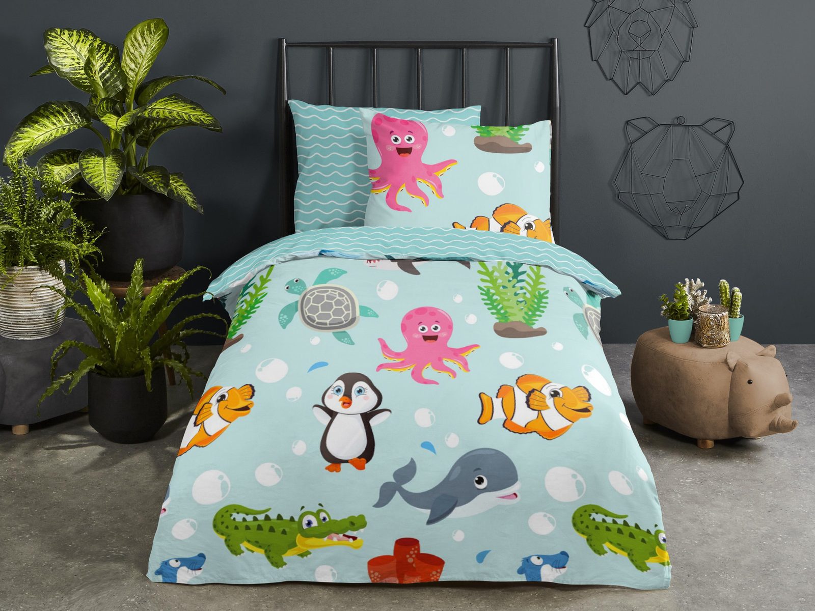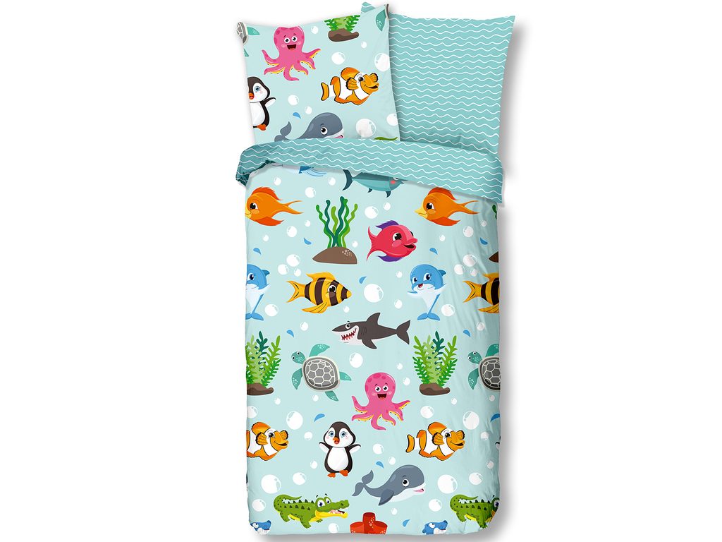 Veselý žrálok, chobotnice, tučňák, rybička i krokodýl. Podmořské veselí na povlečení značky Good Morning. Jemný vzorek vlnek z druhé strany povlaku na deku a na polštáři.