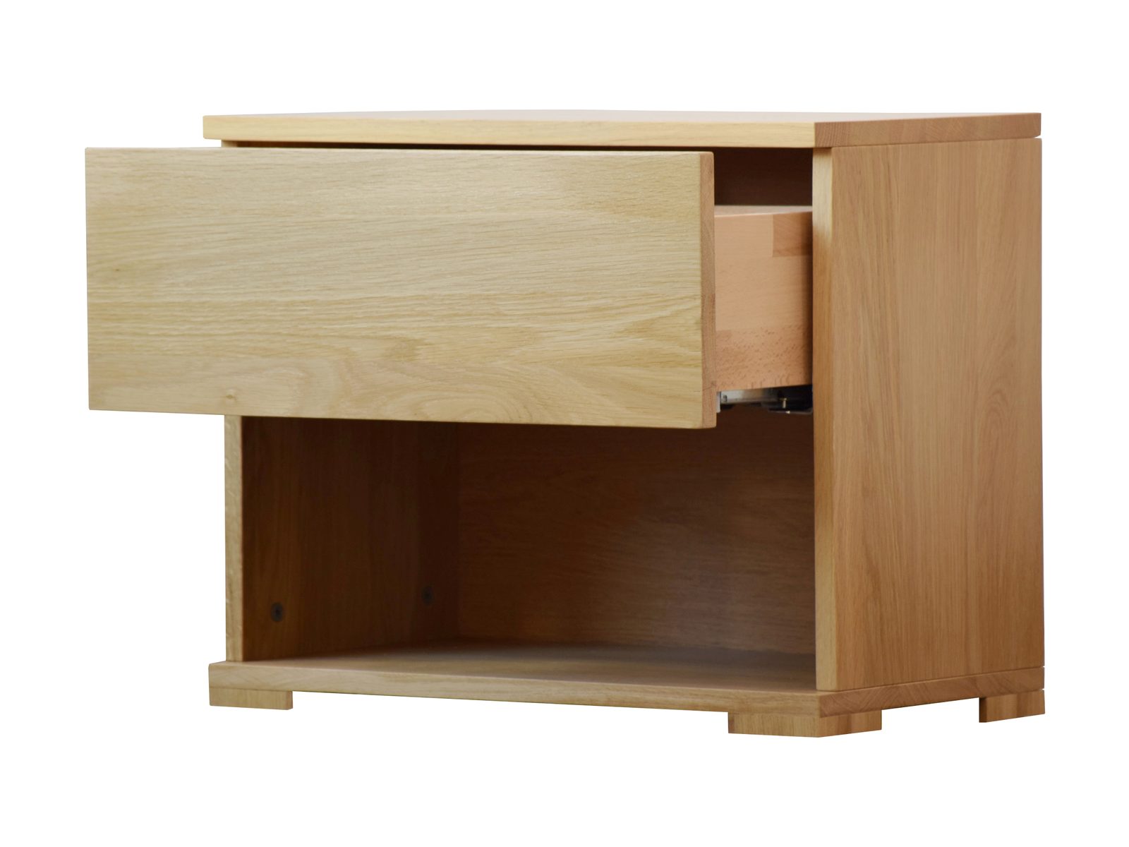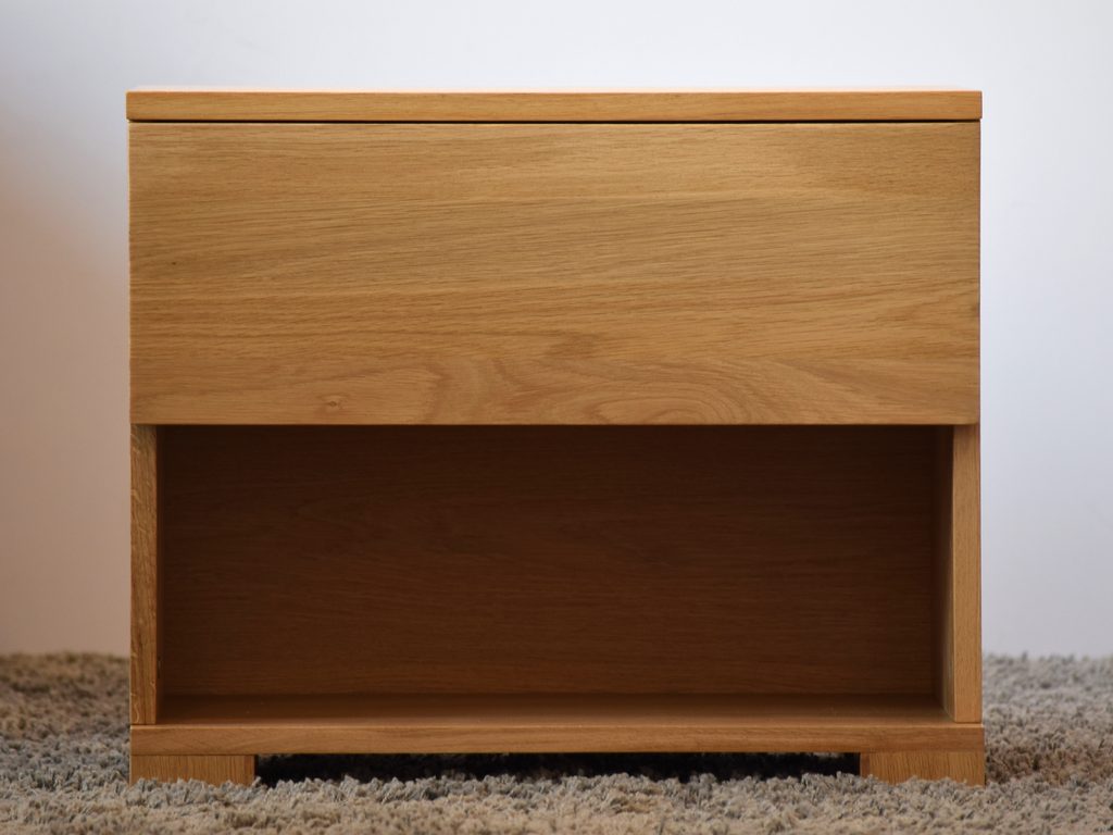 Noční stolek z masivu je tvořen horní odkládací plochou, zásuvkou a spodním otevřeným úložným prostorem. Zásuvka je bez úchytek - otevírání a zavírání zásuvky probíhá zmáčknutím/domáčknutím středu zásuvky (výsuv systémem Tip-on). Použité desky masivu mají tloušťku 2 cm.