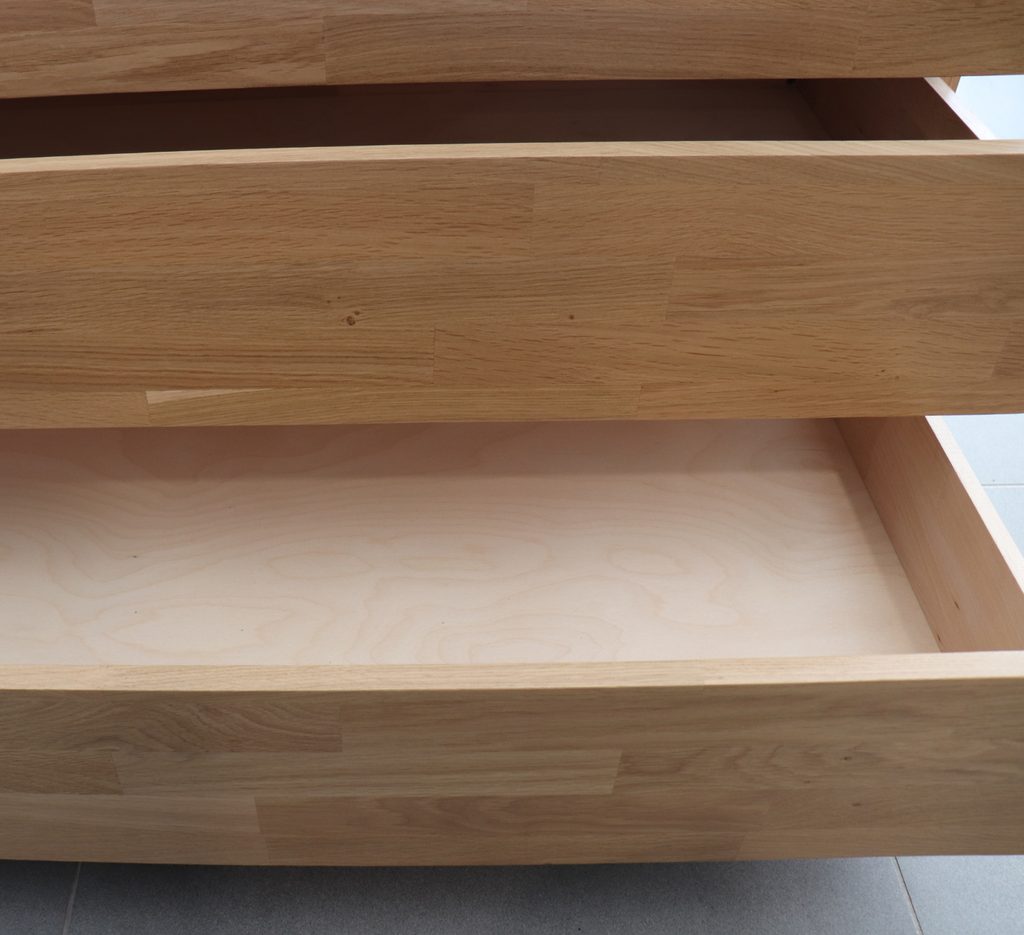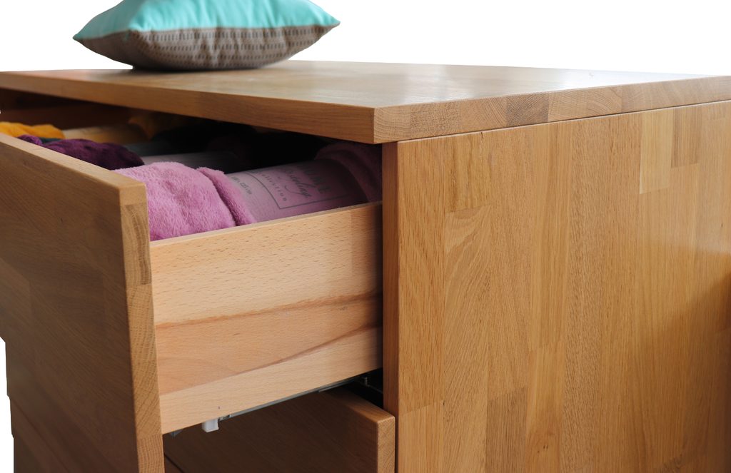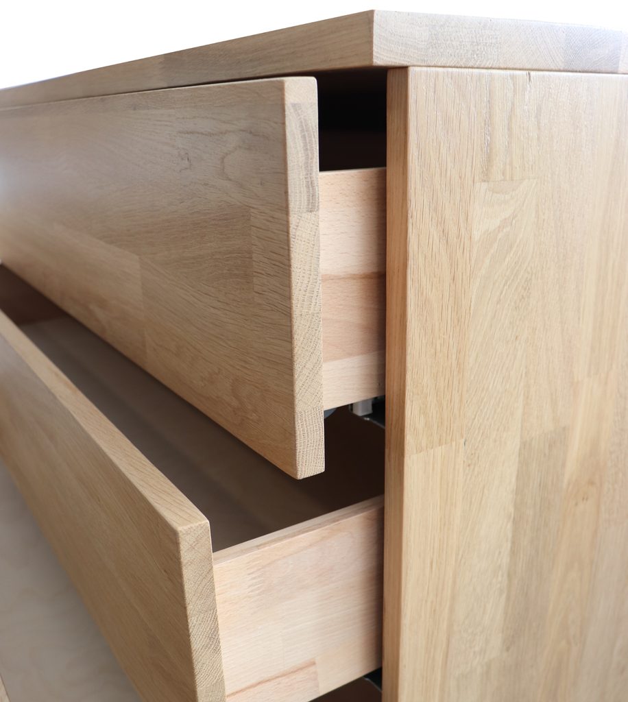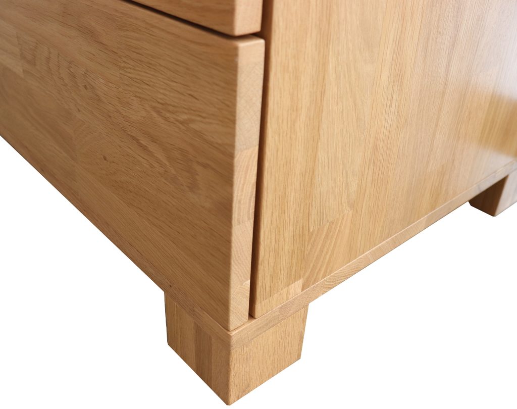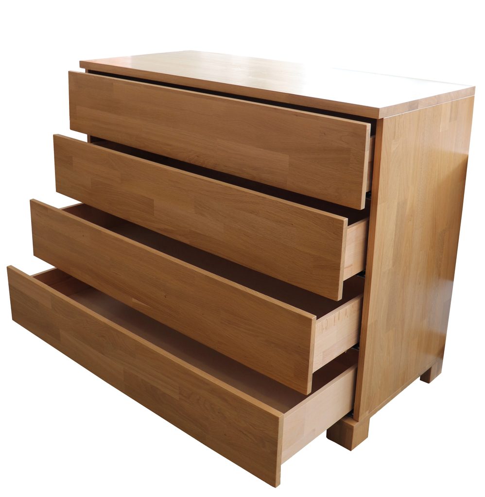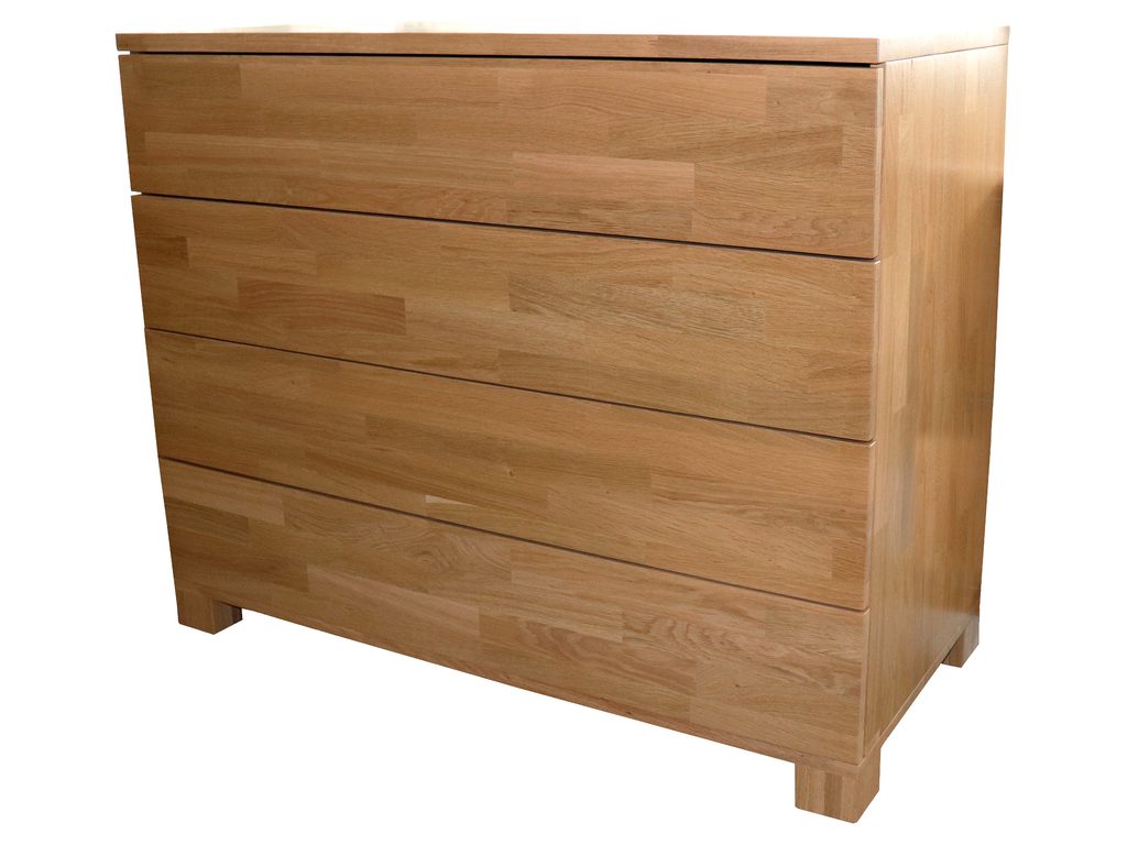 Výstavní kus dubové celomasivní komody se čtyřmi prostornými zásuvkami. Provedení cink, přírodní odstín moření.