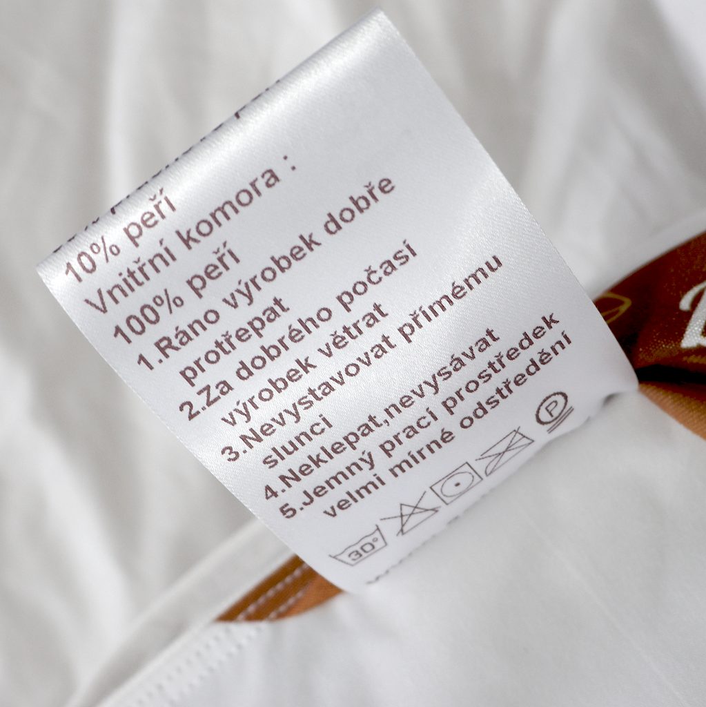 Praní na max. 30°C na mírný/jemný program (nízké otáčky máchání a ždímání). Při praní používejte jemný prací prostředek vhodný na peří. Sušení v bubnové sušičce na nízké teploty (max. 60°C). Možné chemické čištění v čistírně.