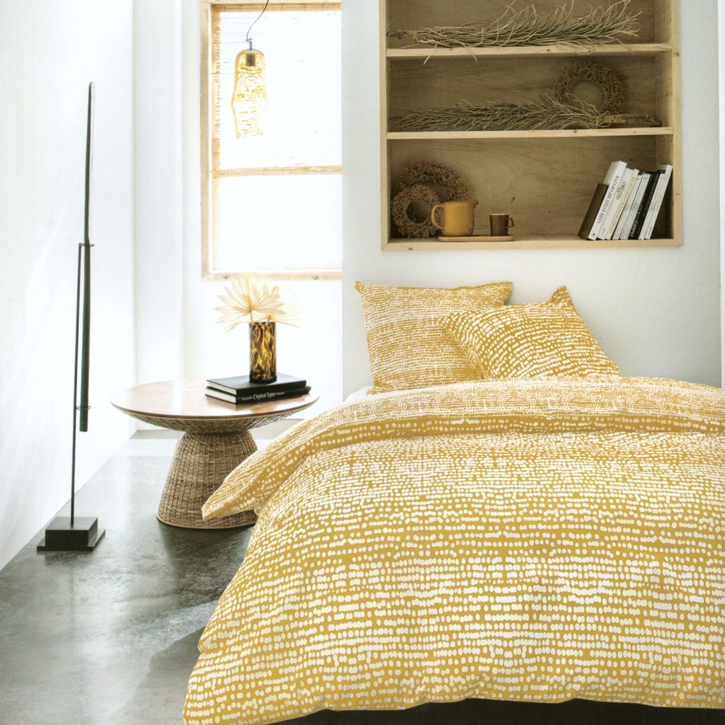 Kolekce Sunshine nabízí povlečení v dvojitém francouzském rozměru. Hořčicově žlutá barva, z jedné strany hořčicové flíčky na bílém podkladu a z druhé bílé flíčky na hořčicové.