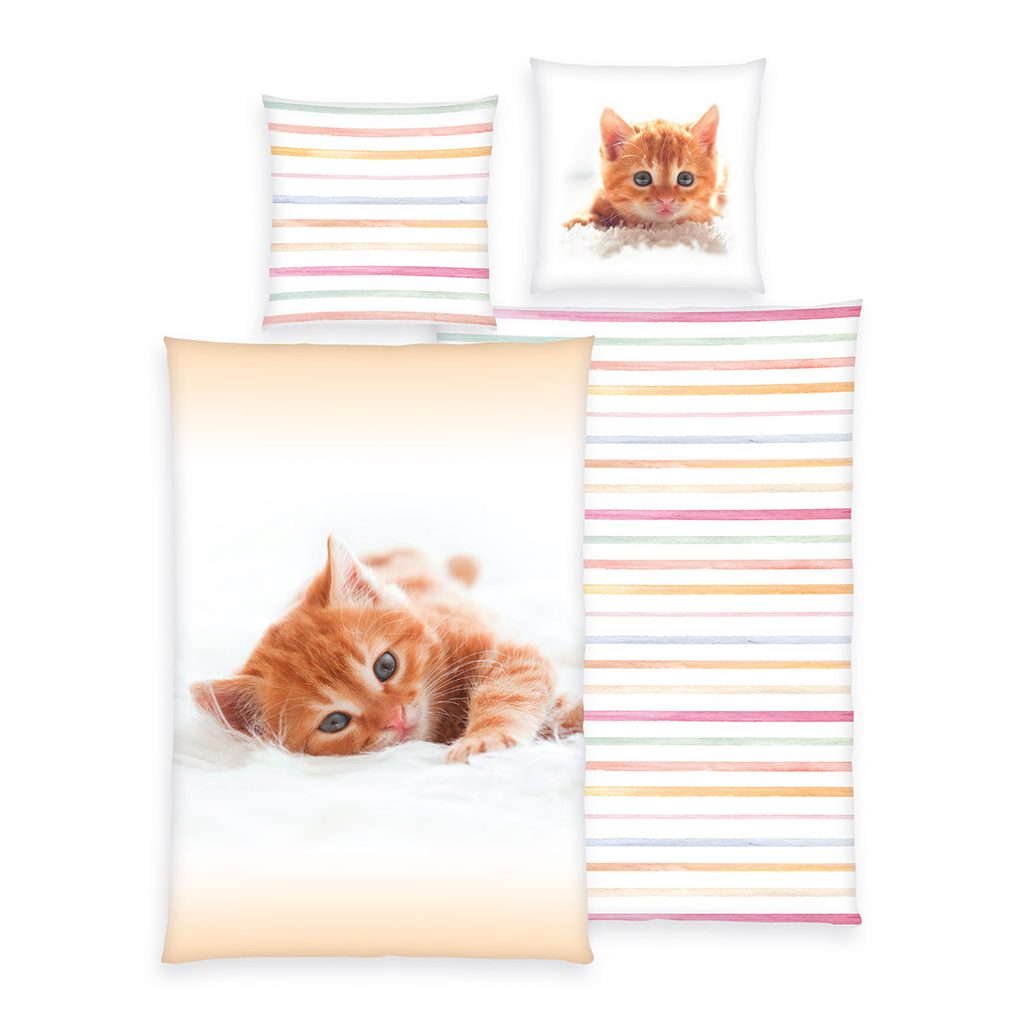 Bavlněné povlečení s roztomilým zrzavým koťátkem a z rubové strany jednoduché proužky.