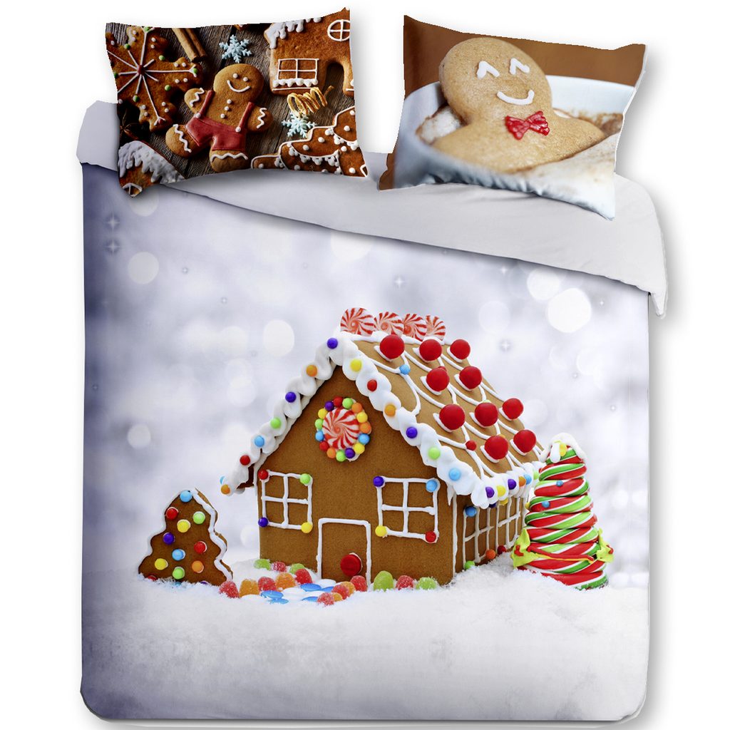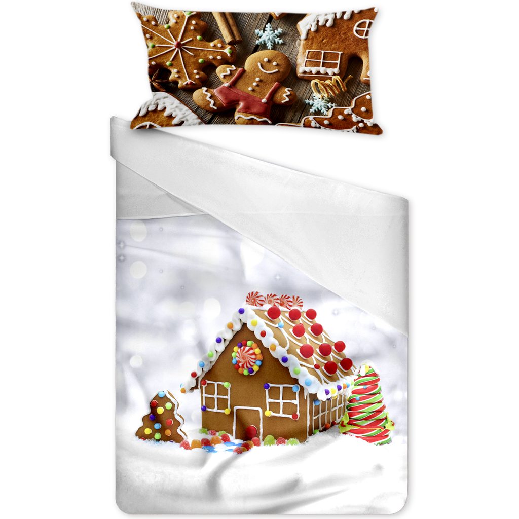 Cukrová perníková chaloupka na povedeném povlečení naladí vaší ložnici do zimní atmosféry vánoc. Italské povlečení s realistickým 3D potiskem. Italský design a výroba. Vtipný motiv perníkové chaloupky.