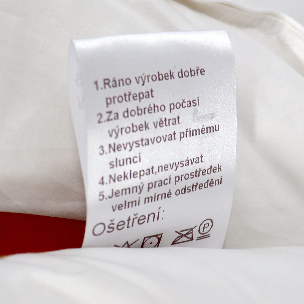 Praní na max. 30°C na mírný/jemný program (nízké otáčky máchání a ždímání). Při praní používejte jemný prací prostředek vhodný na peří. Sušení v bubnové sušičce na nízké teploty (max. 60°C). Možné chemické čištění v čistírně.