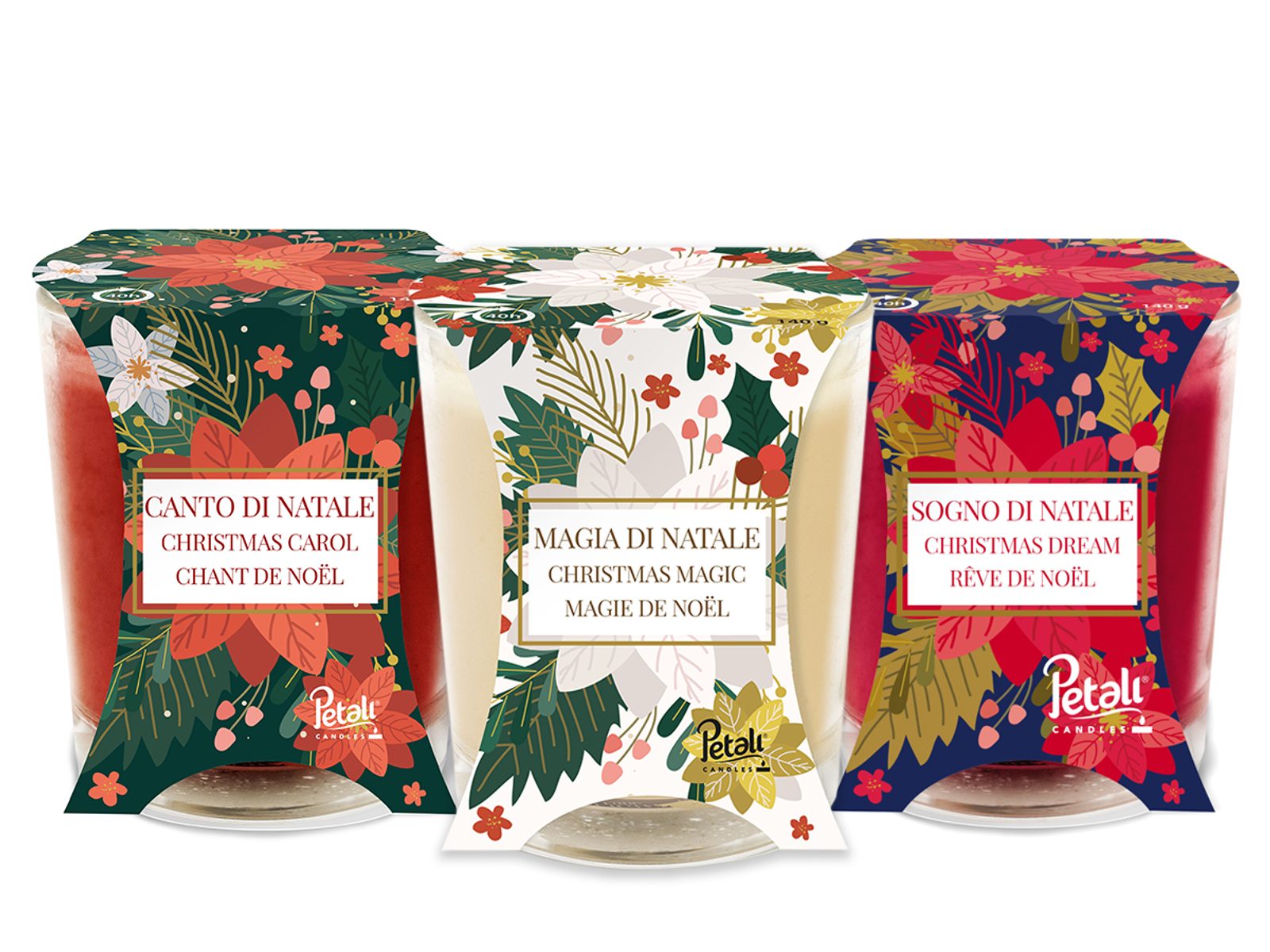 Sada vánočních svíček kolekce Petali. Vůně Christmas Dream, Christmas Carol a Christmas Magic v setu za zvýhodněnou cenu. Doba hoření každé svíčky až 40 hodin.